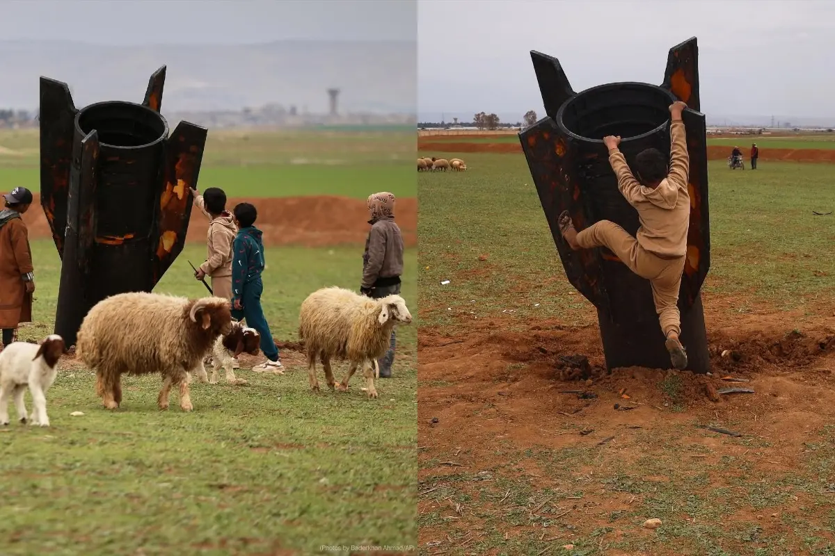 Fotolarda raketin qalıqlarının xüsusən azyaşlı sakinlərin diqqətini cəlb etdiyi görünür. Dünyanın ən qaynar nöqtələrindən biri olan Suriyada uşaqların silahları oyuncaq zənn etməsi təsirli görüntülər ortaya çıxarıb. (Qafqazinfo)