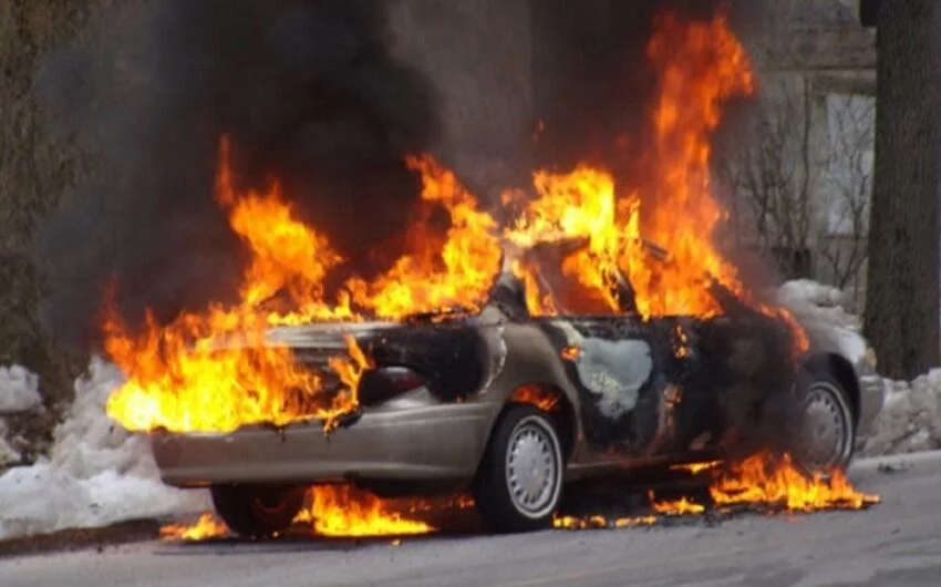 Bakıda minik avtomobili dəmir maneəyə çırpılaraq yanıb Hadisə