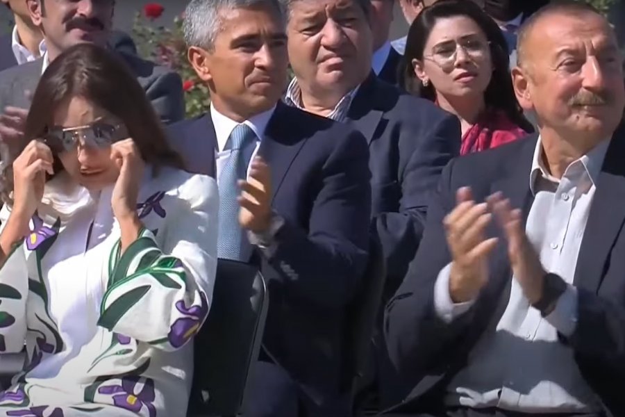 Görüntülərin fonunda Heydər Əliyevin Şuşaya getməklə bağlı arzusu səslənərkən birinci xanım Mehriban Əliyeva kövrəlib.