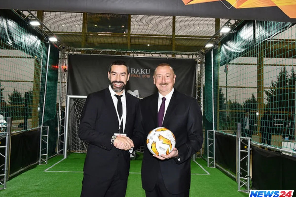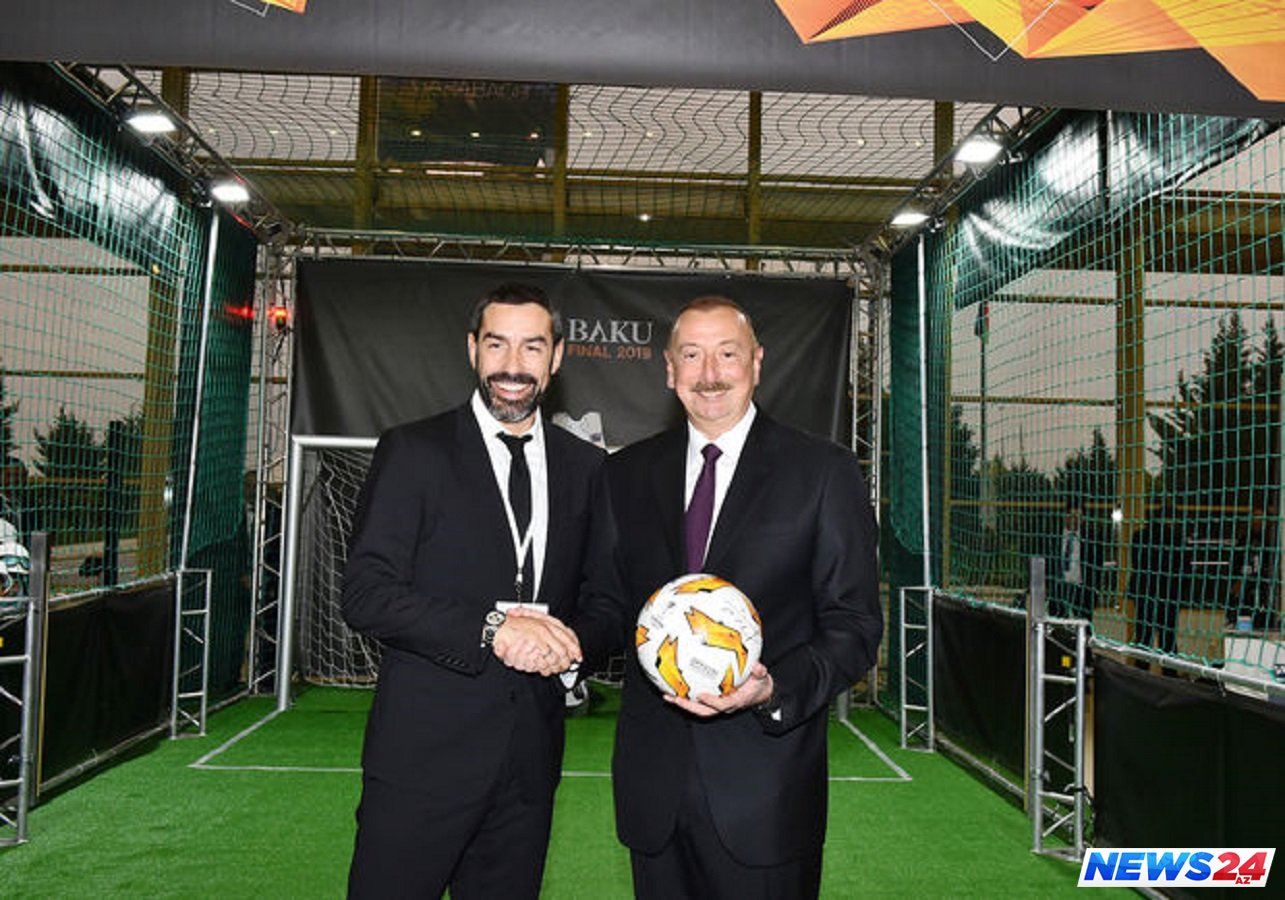 Robert Pires prezident İlham Əliyevə Avroliqanın rəsmi topunu təqdim edib.