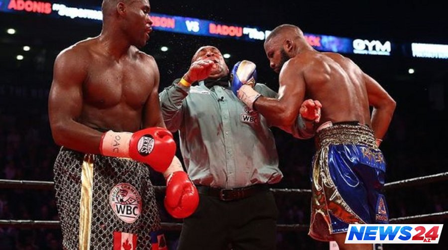 Yarım-ağır çəkidə Boks üzrə Dünya Çempionu titulu uğrunda keçən döyüş. Boksçu Badu Cek hakim İen Con Lüisə zərbə endirir.