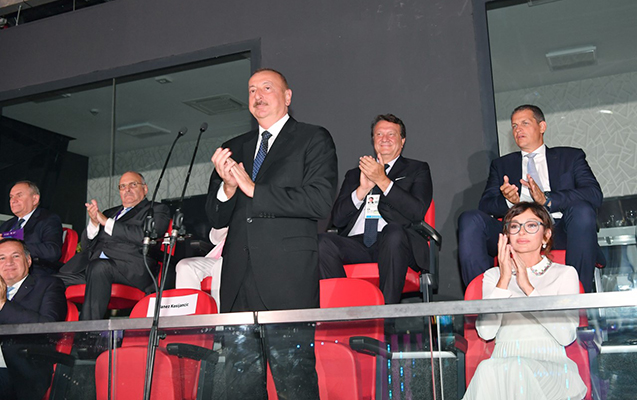 News24.az xəbər verir ki, Azərbaycan Prezidenti, Milli Olimpiya Komitəsinin prezidenti İlham Əliyev, birinci xanım, Azərbaycan Gimnastika Federasiyasının prezidenti Mehriban Əliyeva və ailə üzvləri açılış mərasiminə baxırlar.