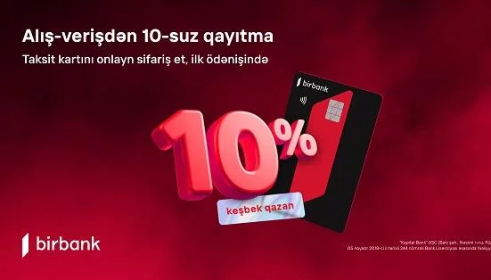Birbank taksit kartı ilə ilk alış-verişdə 10% keşbek qazanın
