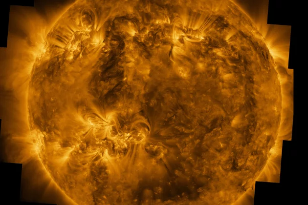 Nəhayət, EUI-nin Günəş tacının təsviri fotosferin üzərində baş verənləri göstərir: milyon dərəcəli plazma maqnit sahəsi xətlərinin ardınca aktiv Günəş ləkələrinin üzərində uzanır.