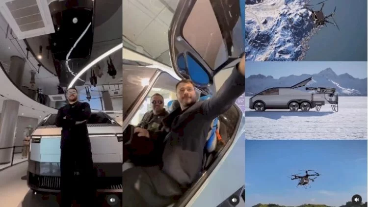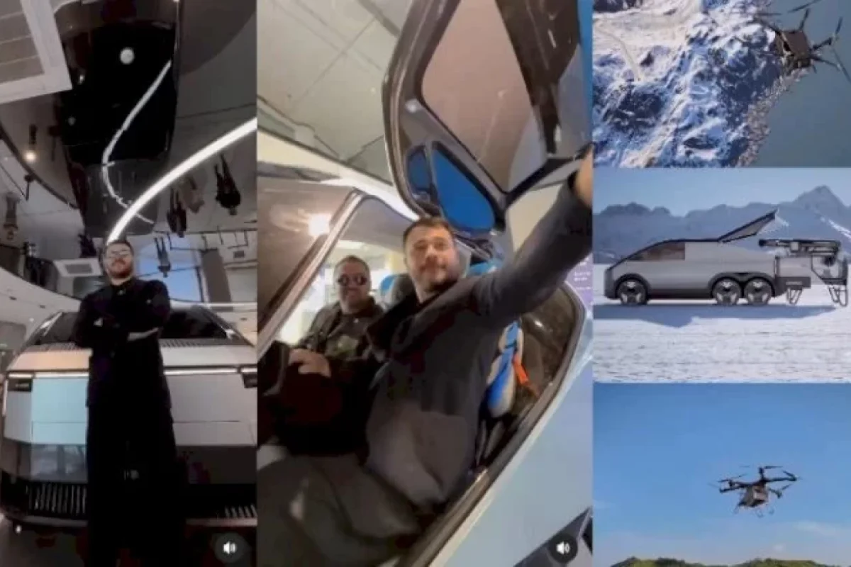 Emin uçan avtomobillərin olduğu məkana yollanıb. O, fotolarına "Bəlkə də uçan maşının ilk sahibi mən olum" sözlərini yazıb. / Yenisabah