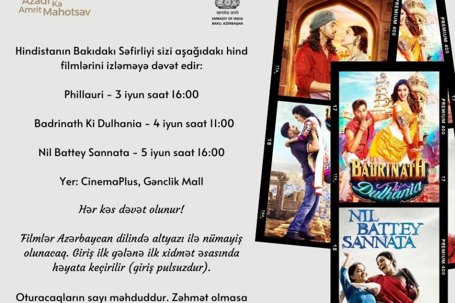 Hindistanın müstəqilliyinin 75 illiyi çərçivəsində Hindistanın Bakıdakı səfirliyi “Gənclik Mall”da yerləşən “Cinema Plus” kinoteatrında Bollivud Hind filmlərinin nümayişini həyata keçirir.
