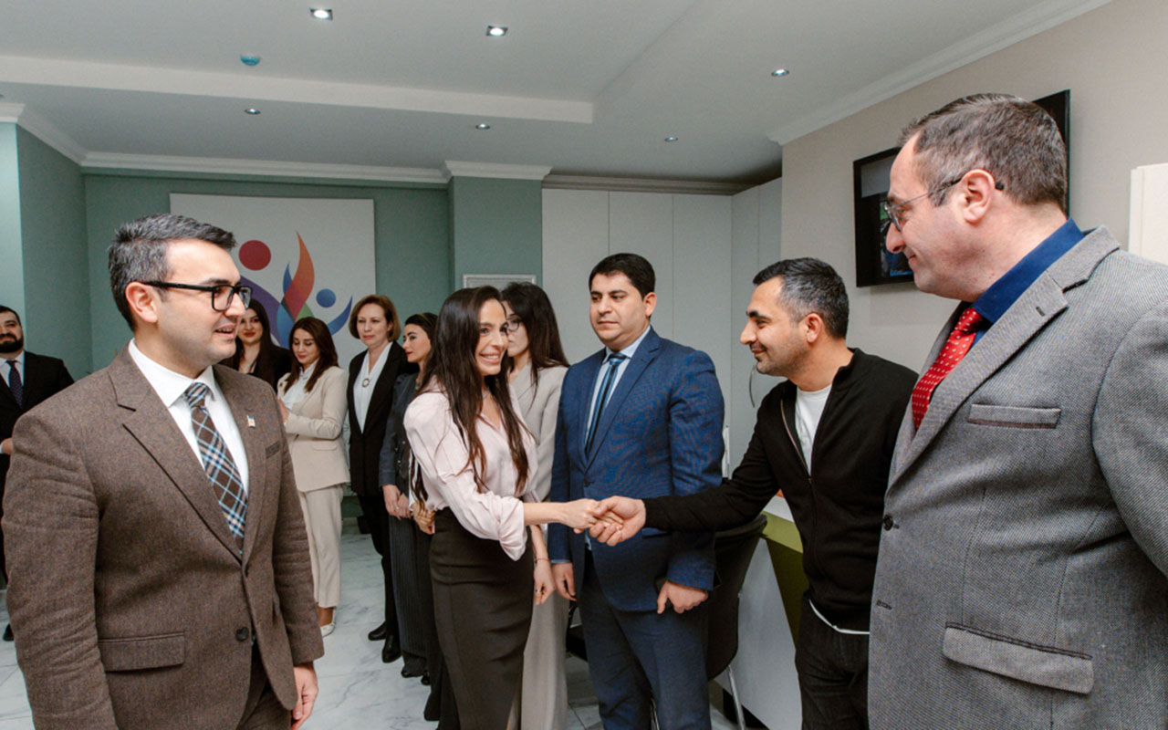 Leyla Əliyeva Mərkəzin kollektivi ilə həmsöhbət olub, onlarla şəkil çəkdirib.