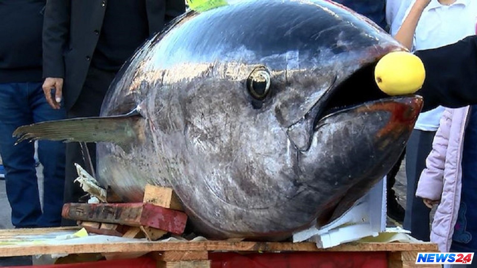 News24.az xəbər verir ki, 290 kilo çəkidə olan tuna balığını 12 nəfərin köməyi ilə sahilə çıxarılıb.