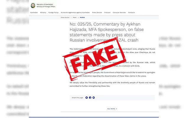 Bununla yanaşı, feyk məlumatda Azərbaycanın guya yalan informasiyaların yayılmasına görə Rusiyadan üzr istədiyi də qeyd olunub.