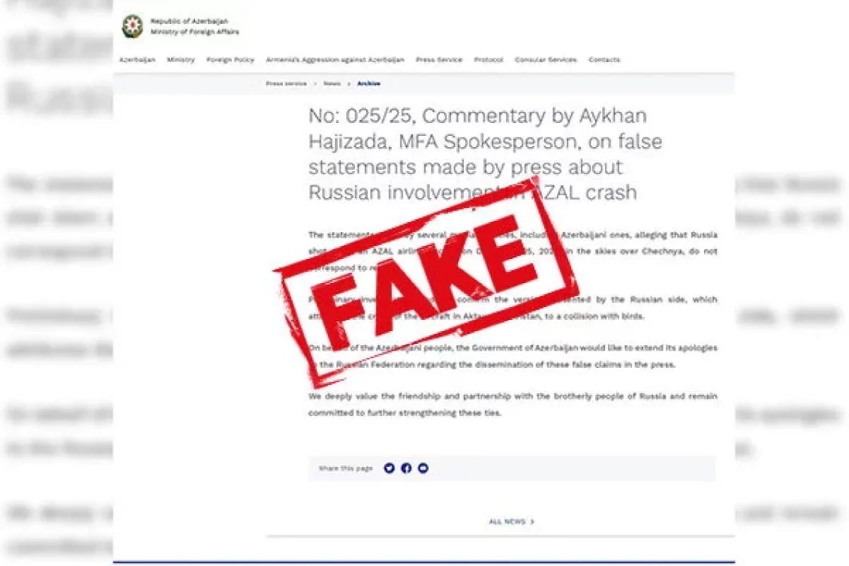Sosial şəbəkələrdə Azərbaycan Xarici İşlər Nazirliyi adından “Azərbaycan Hava Yollarına” məxsus sərnişin təyyarəsinin Aktauda qəzaya uğraması ilə bağlı feyk məlumatlar yayılıb.