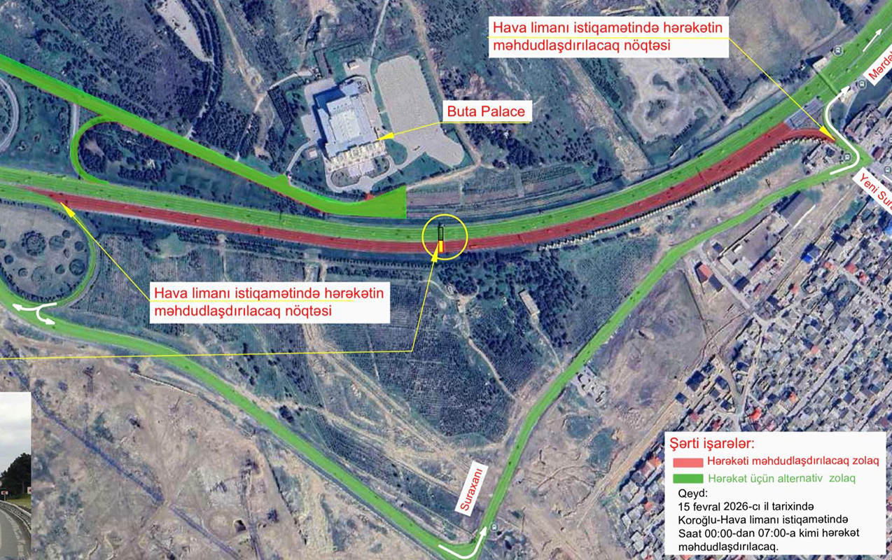 “14-15 fevral tarixlərində paytaxtın Suraxanı rayonu, Hava limanı şosesində (“Buta Palace”nin yaxınlığı) elektron məlumat-sürət tablolarının yenisi ilə əvəz edilməsi məqsədilə həyata keçiriləcək işlərlə əlaqədar sözügedən yolda nəqliyyat vasitələrinin hərəkətinə məhdudiyyət tətbiq edilərək istiqamətlər dəyişdiriləcək.